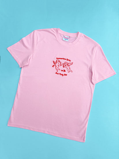 This T-shirt is made of 100% organic cotton in pink with a red embroidered design.